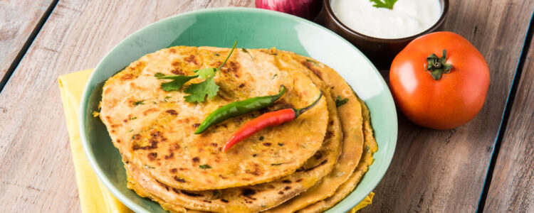 A staple breakfast flatbread stuffed with roasted gram flour, herbs, and spices, often served with pickle and curd.