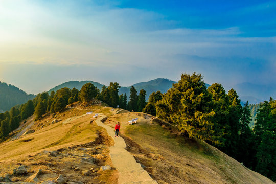 A scenic ridge in Dalhousie offering walking paths, lush greenery, and stunning mountain vistas.