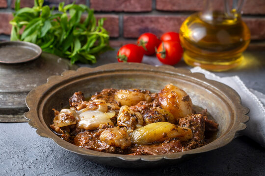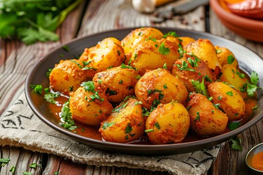 Baby potatoes slow-cooked in a spicy, aromatic gravy of yogurt, fennel, ginger powder, and Kashmiri red chilies, offering a vegetarian delight.