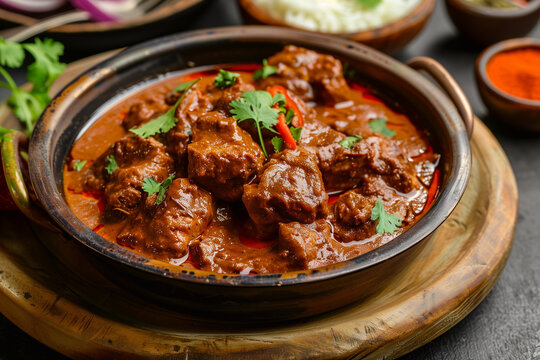 A world-famous aromatic lamb curry with caramelized onions, yogurt, and Kashmiri red chilies, known for its deep red color and rich gravy.