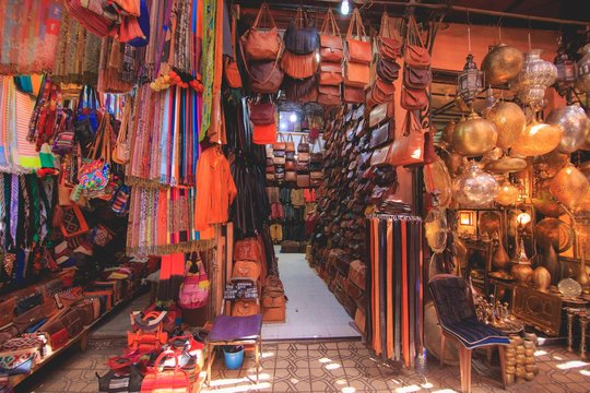 A vibrant local market selling traditional Karnataka handicrafts, silk sarees, wooden toys, and souvenirs, located near the temple entrance.