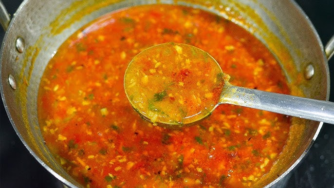 A tangy, spicy toor dal soup made with goda masala and tamarind or kokum, served over steamed rice.