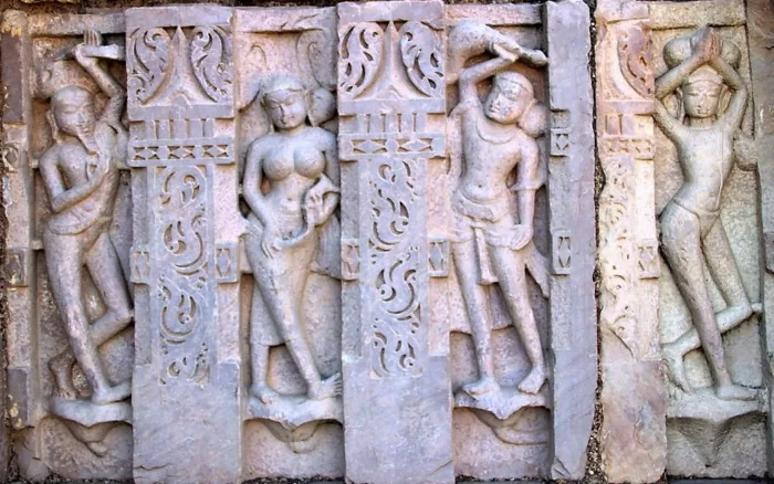 A grand stepwell built in 1699, featuring intricate stone carvings, arched niches, and a narrow staircase descending to water.
